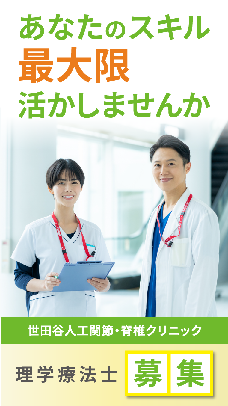 世田谷人工関節・脊椎クリニック、理学療法士の星野と申します。私は大学卒業後、総合病院の整形外科で3年半働き、その後当院に入職、今年で4年目になります。勤務しながら2年間大学院に通い、今年の3月に修士号を取得しました。