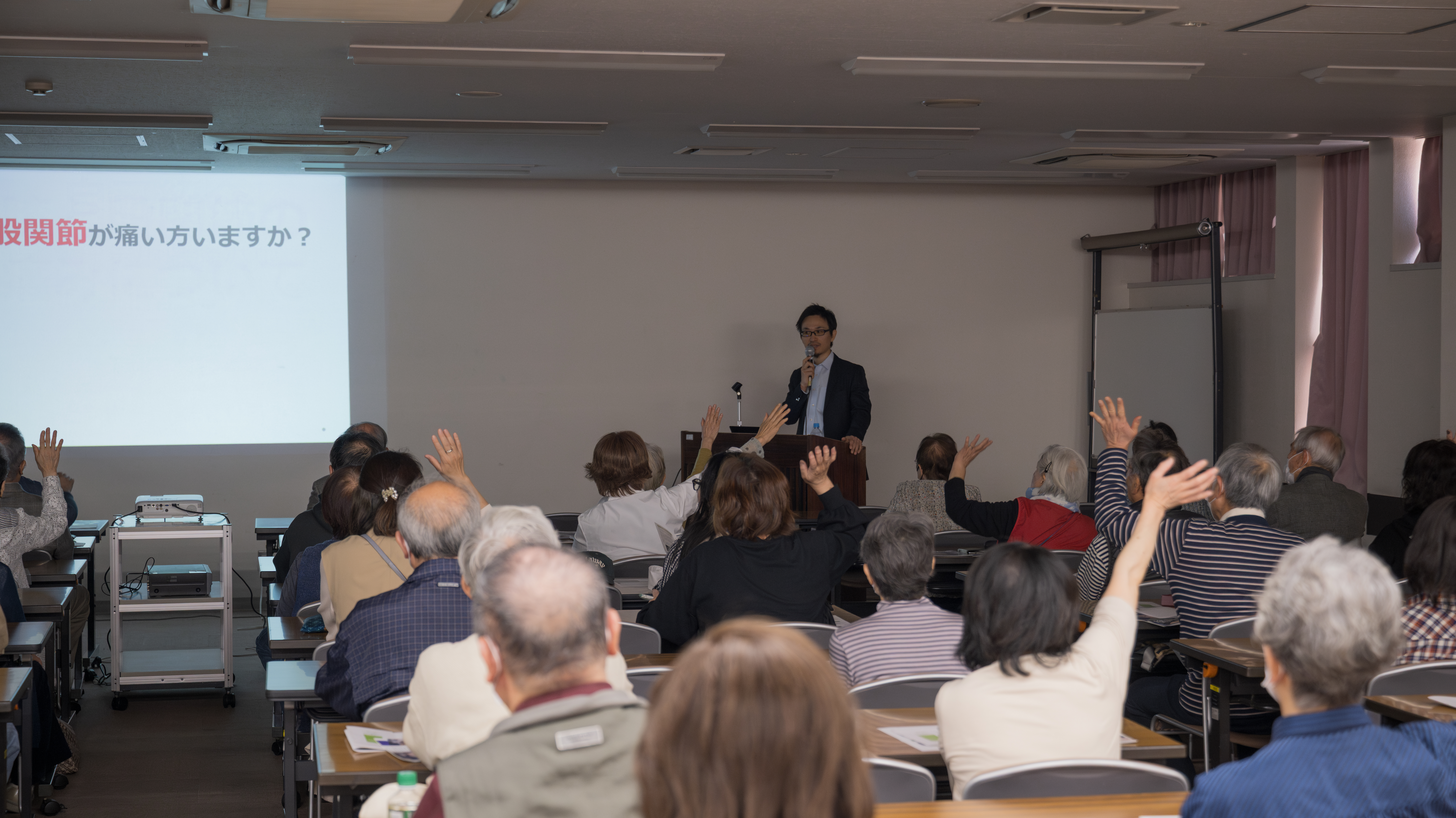 リハビリの重要性や、実際に当院で人工股関節置換術、人工膝関節置換術を受けた患者さんの術前から術後の経過について、患者さんの生の声を交えながら紹介していただきました。