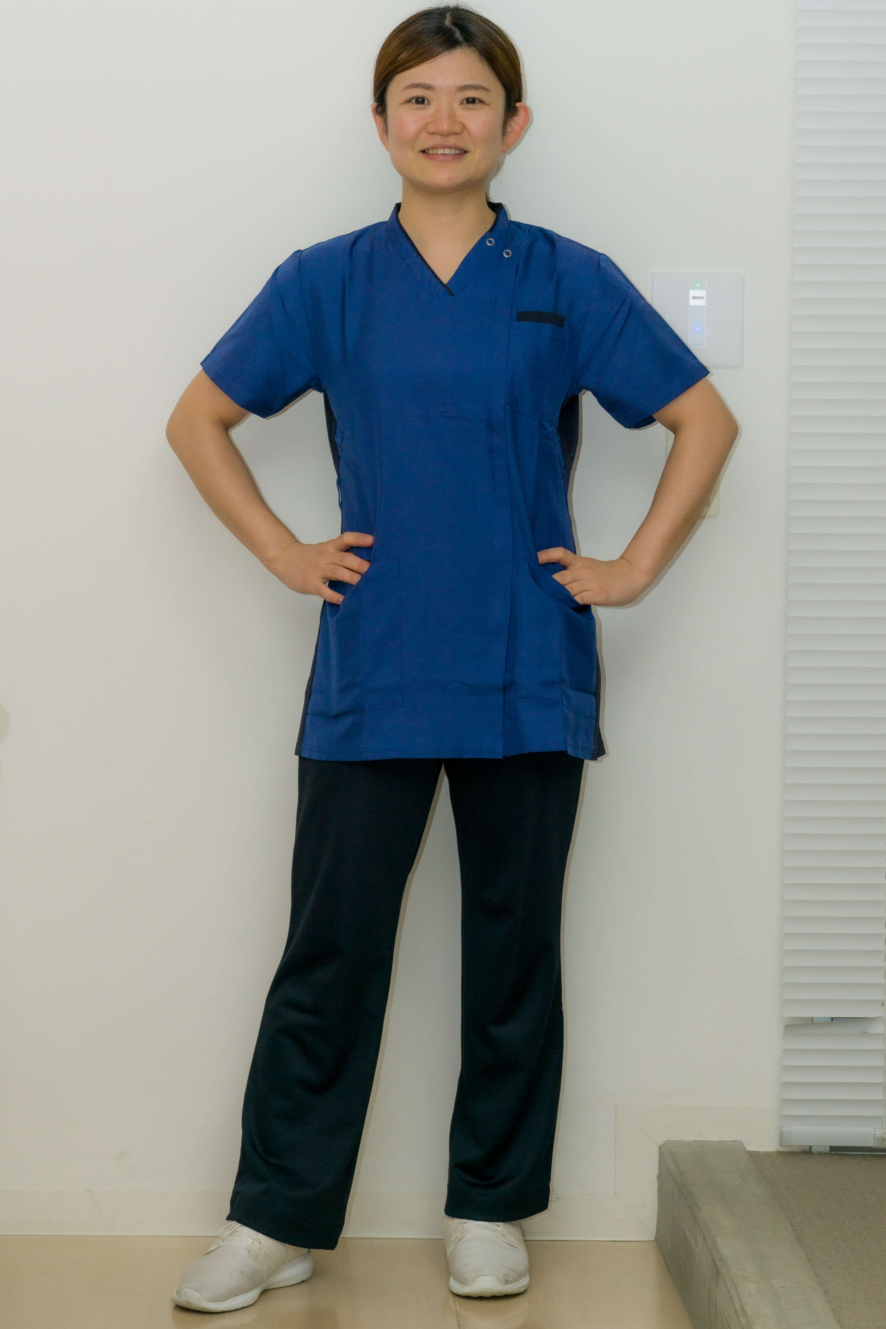 当院では開院以来上が青、下が白の爽やかなイメージのユニフォームを着用していましたが、今回は上が紺、下が濃紺と少しシックなユニフォームにしてみました。