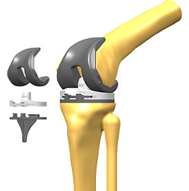 人工膝関節は金属製の大腿骨コンポーネント、脛骨コンポーネント、プラスチックでできたベアリングがはまるようになっています。人工膝関節によって滑らかな膝関節の動きが再現できます。痛みの原因となるすり減った軟骨と傷んだ骨が人工物に置き換えられて痛みがなくなることで、日常の動作が楽になることが期待できます。