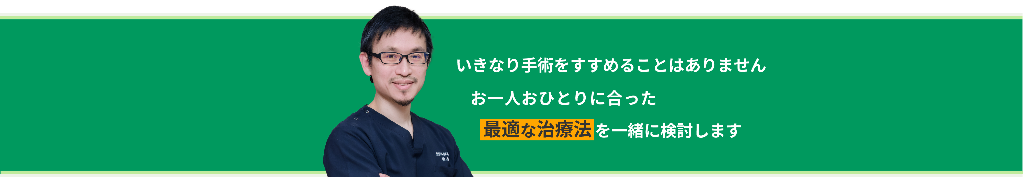 診察では患者さま一人ひとりに合わせた最適な治療をご提案します。手術を選ばれた場合も、入院・手術・リハビリ、さらに退院後のアフターケアまで、私たちが責任を持って一貫してサポートいたします。