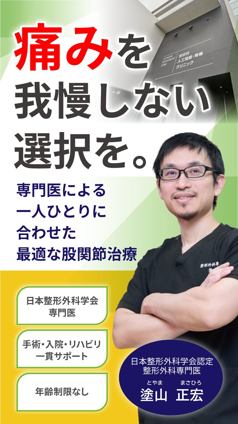 世田谷人工関節・脊椎クリニックは、人工股関節手術、人工膝関節手術、脊椎手術に特化したクリニックです。長期にわたり保存療法を続けているが症状が改善しない方、痛みで日常生活に支障がある方、手術する施設を検討されている方に対し専門医がお一人おひとりのお悩みに寄り添い、患者様にあわせた治療方法を提案してまいります。