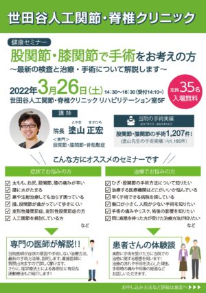 3/26(土)に「股関節・膝関節セミナー」を開催いたします。